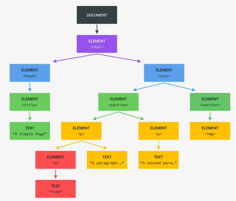 The “document” seen at the very top is important, as its the entry-point into the DOM structure with JavaScript. The first child element of the DOM is the HTML itself, then it keeps going down the child list with each element, tag, text, etc. There is even DOM elements for stuff like comments, because of a rule stating “if its in the HTML file, its in the DOM tree too”.